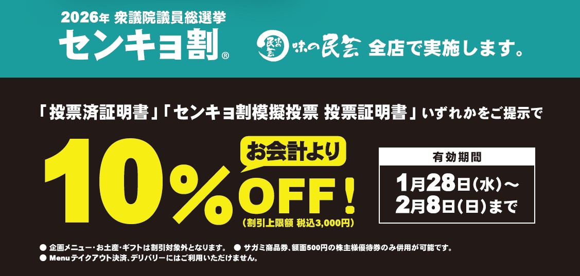 【衆議院議員総選挙】 投票に行ってお得に! 「センキョ割」の実施店舗数を拡大し実施! 期間中「投票済証明書」または「センキョ割模擬投票 投票証明書」 を提示で特典が受けられます。 ※業態により実施期間・サービス内容が異なります。 ※グループ実施業態の全251店舗で開催(一部業態では未実施)